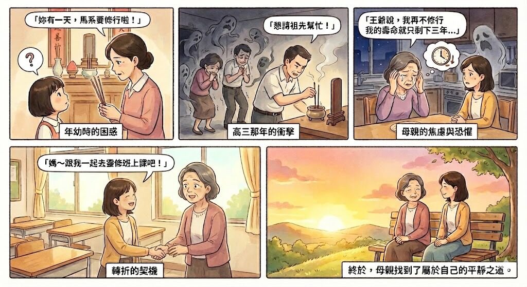 「妳有一天,馬系要修行啦!」這是我母親在我年幼時種下的一顆小種子,但當時的我又豈會瞭解什麼叫做修行?修行這件事,看著我的母親追了幾十年的答案,卻也始終看不懂。如果這就叫做修行,那份籠罩在迷惘中的無所適從,我尊重但我不想要。